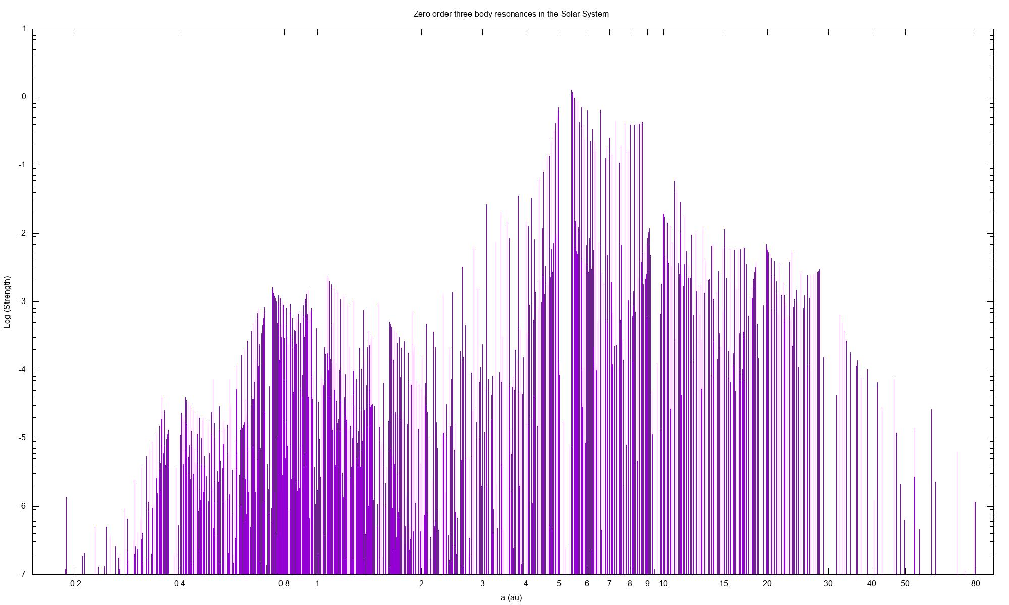 The present list is composed by the strongest three-body resonances between 0.1 and 100 au for